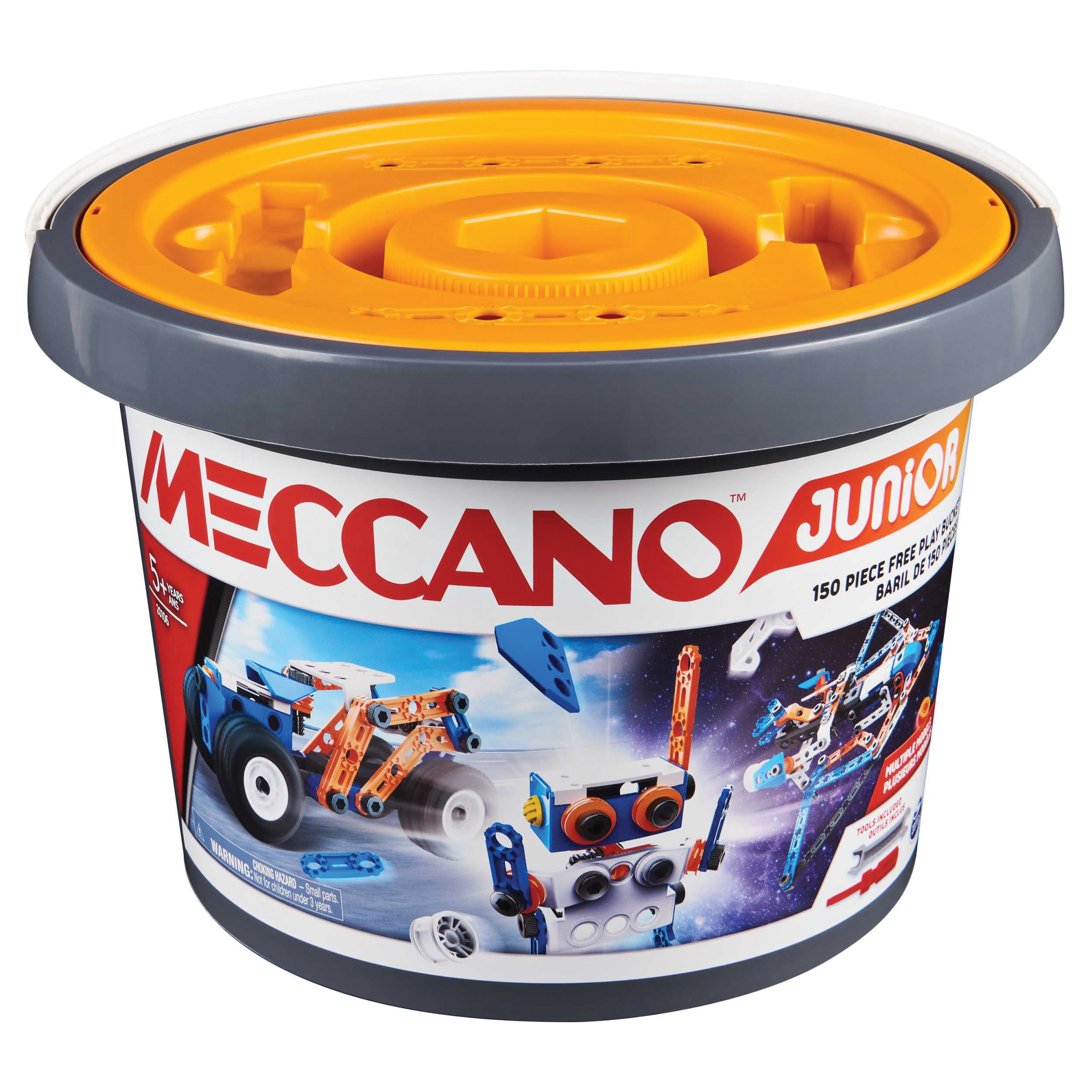 Give your child everything they need to build unlimited creations with the Meccano Junior 150-piece Free Play Bucket. Ideal for first-time builders, this STEAM building kit comes with an easy-to-follow instruction sheet for three different builds to inspire creativity. With redesigned parts and tools, it's easier than ever before for kids to build a car, robot, space shuttle and more. Kids can snap nuts onto parts to make them lock and use the bolts to hold pieces together and stay-in place as they build. As your young inventor assembles their very own creations, they'll learn how principles from science, technology, engineering, arts and math are practically applied.