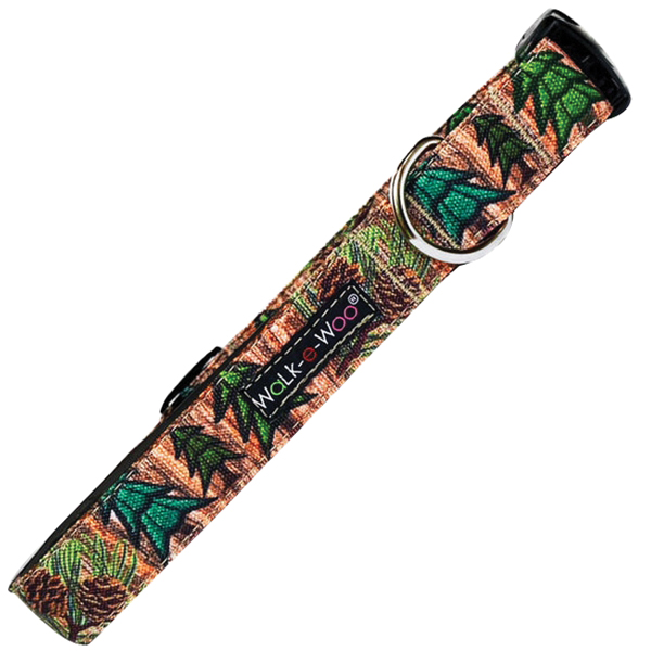 WaLk-e-Woo Nature-Lover Dog Collar, Design/Theme: Into the Woods, Neck Size: M, Collar Width: 1 in, Collar Length: 12 to 18 in, Fabric/Nylon, Fastening Method: Quick-Release Buckle, Resists: Dirt, Water
